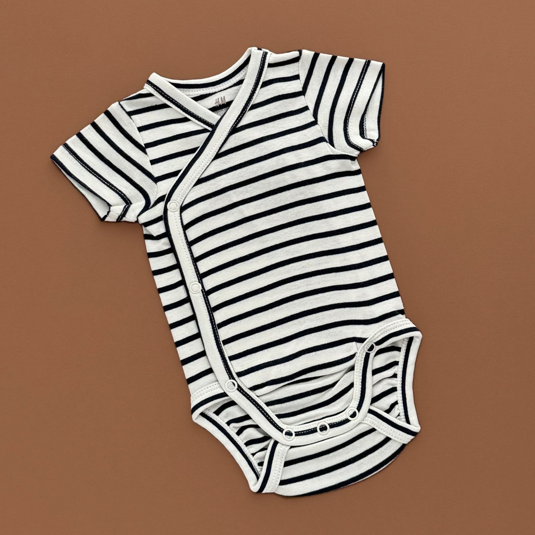 | НаименованиеПолное | Боді з коротким рукавом, на запах, темно-синій/полоска | |