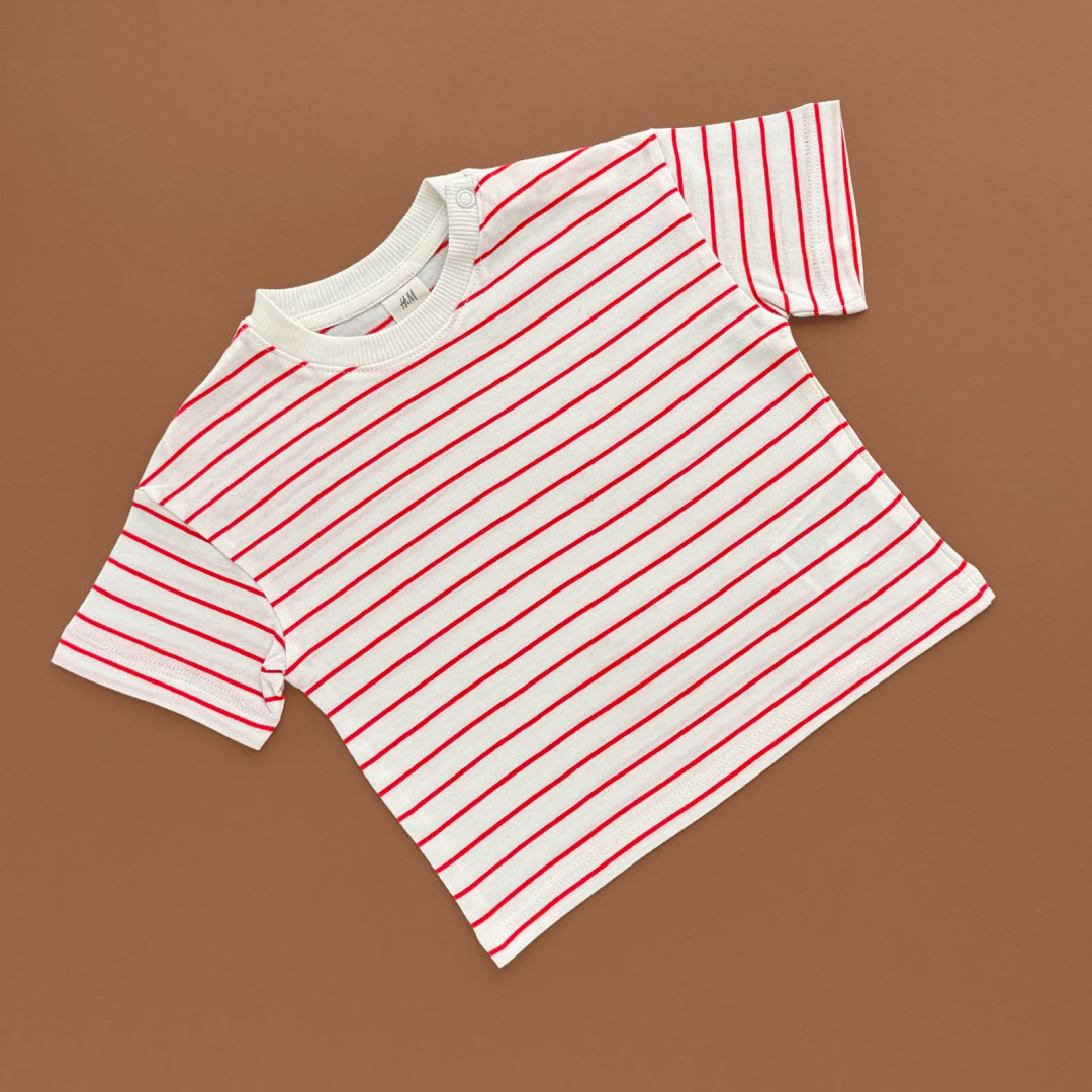 | НаименованиеПолное | Футболка H&M, гудзик на плечі, молочний/червона полоска | |