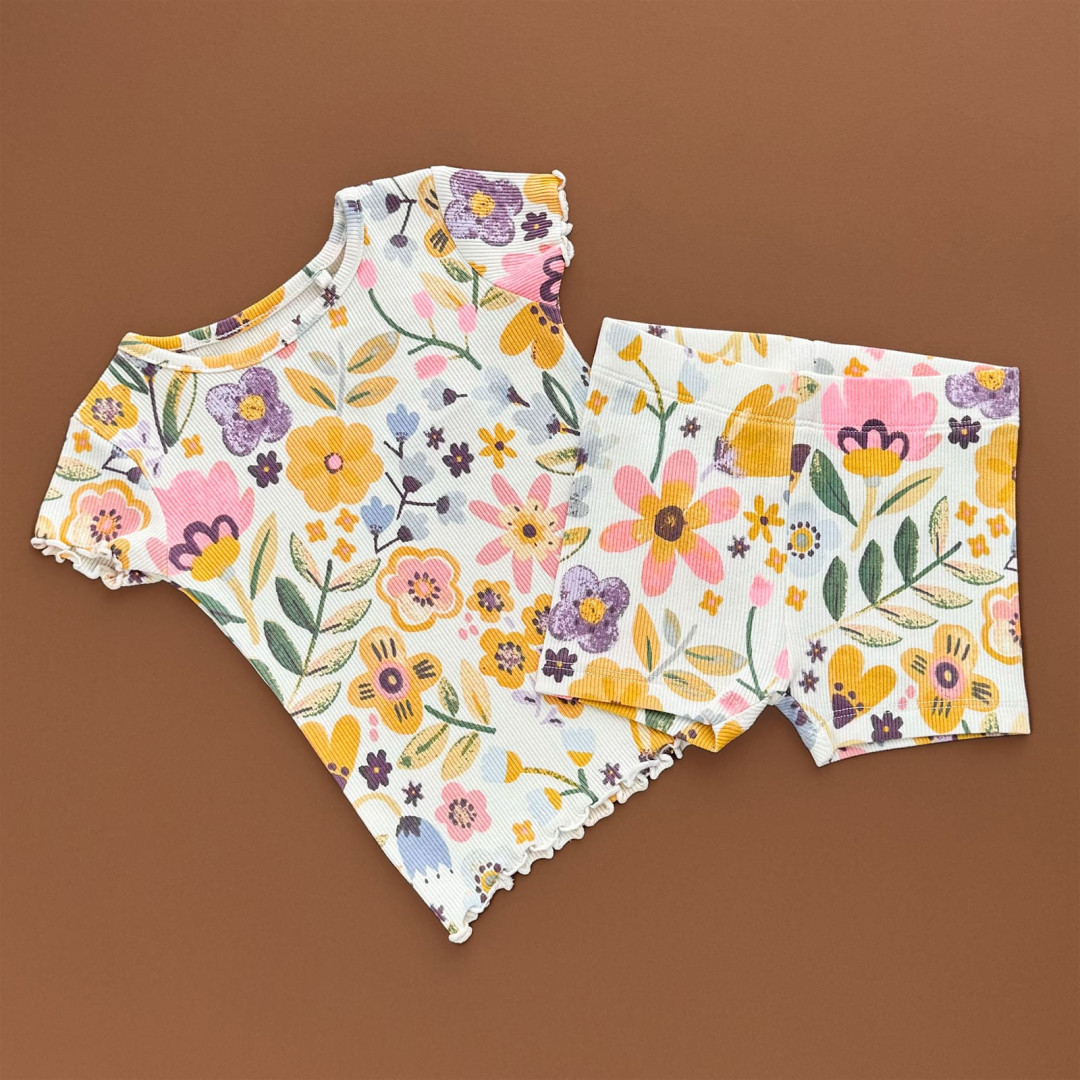 | НаименованиеПолное | Костюмчик Футболка з шортами, молочний/рубчик квіти | |